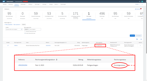 Wenn Sie auf die Belegnummer klicken, gelangen Sie in den Beleg und können die Fehlermeldung sehen.