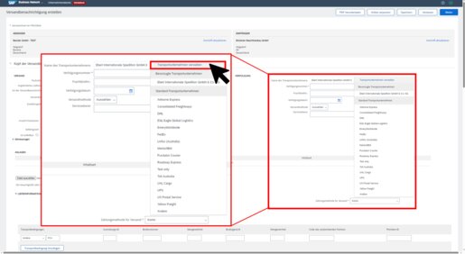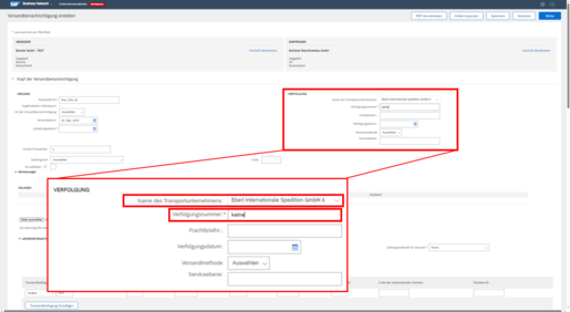 Der Eintrag „Eberl Internationale Spedition GmbH & Co. KG“ erscheint in allen zukünftigen Versandbenachrichtigungen zur Auswahl im Drop-Down-Menü „Name des Transportunternehmens“.