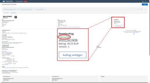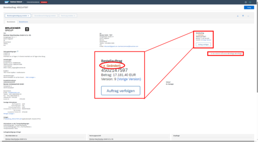 Der Brückner Maschinenbau hat eine Bestelländerung gesendet, die noch nicht bestätigt wurde. Nach einer Bestelländerung springt die Revision der Bestellung von „Original“ auf „Geändert“. Zusätzlich wird eine neue Version der Bestellung angelegt. Weiterführende Informationen können Sie unter „Welche Art von Bestelländerungen gibt es?“ finden. |