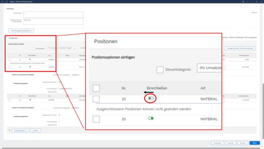 Um Materialien aus einer Rechnung auszuschließen und diese in einer späteren Rechnung zu integrieren, entmarkieren Sie dieses Material in den Positionsdetail durch den Schieberegler „Einschließen“.