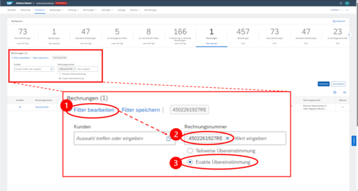 Geben Sie bei „Filter bearbeiten“ die Belegnummer ein und wählen Sie „Exakte Übereinstimmung“. Nach „Anwenden“ wird Ihnen in der Tabelle der gesuchte Beleg angezeigt.