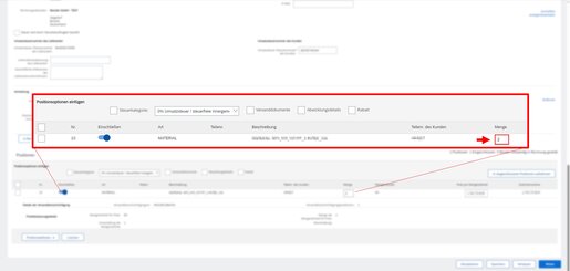Im Abschnitt Bestellauftragspositionen können Sie die ausgewählten Positionen für die Versandbenachrichtigung nochmals bearbeiten.