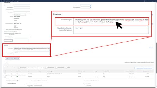 Eine Anmerkung kann wie folgend in einer Rechnungsstellung erfasst werden: