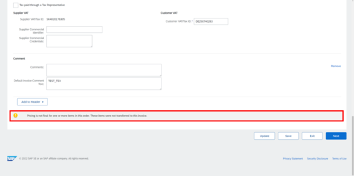 At the moment it is not possible for you to submit an invoice, because our colleagues from the purchasing department have not yet fixed the price.