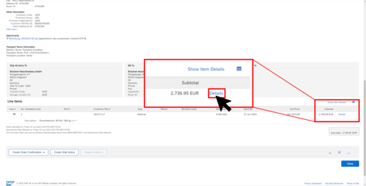 The item has been cancelled by Brückner Maschinenbau. However, you have not yet been notified of the order change via SAP Ariba.