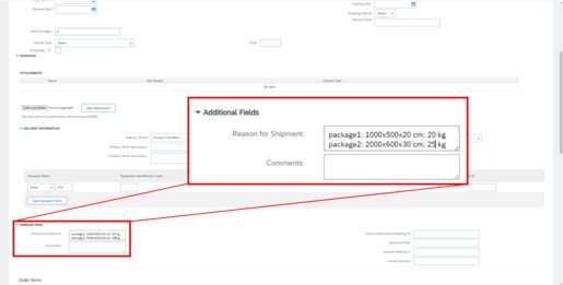 If you assign the forwarding agency EBERL, enter the packing material, dimension and weight of the packages in the field “Reason for shipment”.