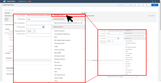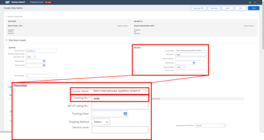 In the ship Notice, under “Name of shipping company”, select the list entry “Eberl International Spedition GmbH & Co. KG”. In the field „Tracking Number“ enter „none“.